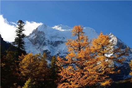 從稻城前往亞丁的路上會穿越川西風(fēng)光最美的彩色林帶,領(lǐng)略神奇的四季更替;洛絨牛場上的移動牧群點綴在一片金黃之中,猶如浮動的云朵,煞是好看。