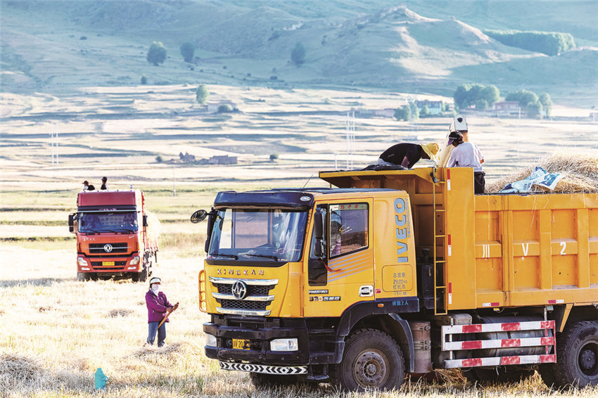 甘孜縣是我州的農(nóng)業(yè)大縣,也是全國(guó)青稞商品糧基地之一,素有“康北糧倉(cāng)”的美譽(yù)。日前,在甘孜縣仁果鄉(xiāng)青稞收割現(xiàn)場(chǎng),一望無垠的田地里麥浪滾滾、麥香四溢,一臺(tái)臺(tái)聯(lián)合收割機(jī)在金色的青稞地里來回馳騁,時(shí)不時(shí)停下來“吐出”金燦燦的青稞,農(nóng)戶們的臉上露出豐收的喜悅笑容。