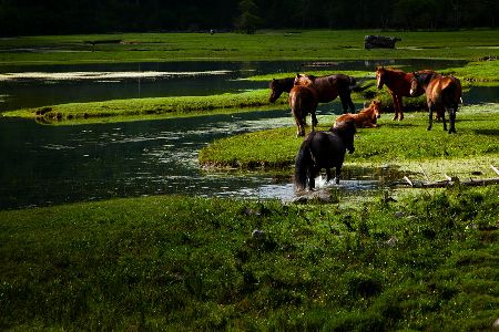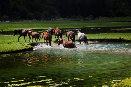 康定蓮花湖有純凈的陽光、湛藍的天空、綠毯般的高山草甸、燦若繁星的野花、藍寶石般的高原湖泊、銀鏈般的溪流迂回盤旋、高大的康巴駿馬,還有在風中獵獵飛舞的經(jīng)幡。
