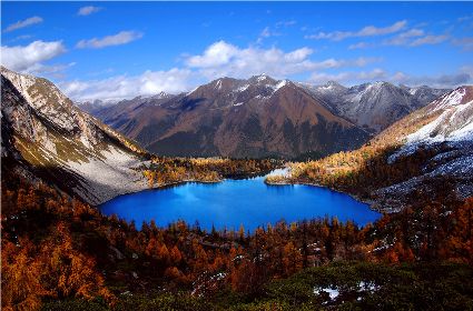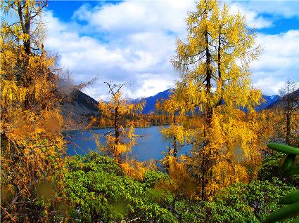 丹巴的秋是有著美麗色彩的季節(jié),你瞧,在峽谷兩岸的山巔,那一簇簇綠樹(shù)在一夜之間竟然點(diǎn)綴上了黃的、紅的顏料,就像是一名丹青能手不小心間打翻了調(diào)色盤,讓那些靈動(dòng)的顏料在樹(shù)冠上潑灑。黃色的樹(shù)葉正印證了“滿樹(shù)盡帶黃金甲”的意境,黃得透徹,黃得潔凈。而那些紅色的樹(shù)葉,猶如盛開(kāi)的鮮花,在逐漸蕭條的秋日里顯露出勃勃生機(jī)……那一片片黃紅綠相間的顏色,一寸一寸的往下挪移,讓看慣了春色綠野滿山的人們驚呼大自然的鬼斧神功之作。山腰,蔥綠的樹(shù)一棵連著一棵,密密層層,頑強(qiáng)地抵抗著秋風(fēng)的寥落,然而,那黃的紅的顏料終歸于要流向峽谷底,所經(jīng)之處,風(fēng)刺骨,葉瑟縮,大地又將再次被剝蝕掉華麗的外衣,露出山的嶙峋。我想,在山巔,那些樹(shù)葉在秋寒的作用下,依依不舍地與樹(shù)枝作別,隨風(fēng)抖落,在樹(shù)林中上下翻飛,猶如一只只美麗的彩蝶在林中翩翩起舞,當(dāng)落到地面上時(shí),發(fā)出生命即將逝去時(shí)的低低嘆息聲,然而那哀傷卻沒(méi)有醞釀太久,幾只小蟲(chóng)迅速地聚集在葉片底下,為尋找到過(guò)冬的庇護(hù)所而興奮不已,那些葉片也感受到了生命存在的意義,為自己即將化為塵土前還能再次發(fā)光發(fā)熱而激動(dòng)。跟隨著秋的步伐,獨(dú)自一人穿行在秋色滿滿的樹(shù)林中。眼前,一片片落葉漫空飛舞,伸出雙手,讓那些黃的紅的葉片降落在手心里,一絲淡淡的蘋果香味從小小的葉片中透出,悠悠的在我鼻尖縈繞。那一片片落葉,不正是秋日向大地母親發(fā)出的明信片嗎!春夏兩季,大地母親用自己的乳汁哺育著這些葉片,泛著健康的綠色,渲染了大地,茁壯的成長(zhǎng)。那透心的綠,將大地裝扮得格外的妖嬈,充滿了無(wú)限的活力。秋日漸近,它們?cè)谇镲L(fēng)的浸透下,剝蝕掉綠色的外衣,消耗掉多汁的綠葉,逐漸的消瘦,最后薄如蟬翼,在秋風(fēng)的吹拂下,在大地母親的召喚下,終于脫離枝條,晃晃蕩蕩的飄向地面。