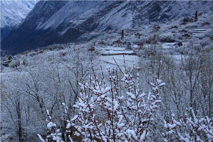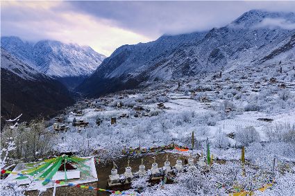突然,耳畔傳來了誦經(jīng)聲。山坡下的平臺上,是一排白塔。白塔的周圍,掛滿了經(jīng)幡。早起的誦經(jīng)人,沿著中路藏寨的小路來到白塔,一邊轉(zhuǎn)白塔,一邊虔誠誦經(jīng)。一年四季的地區(qū)稱春雨貴如油,那么旱雨兩季的地區(qū)該怎么贊美春雪呢?怕是該稱為春雪貴如金了。祈愿吧——一年好時節(jié),又是一個豐收年!
