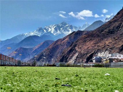 陽(yáng)光碎碎的灑下,穿透過(guò)空氣,我們一邊狠吸含有陽(yáng)光的空氣,一邊欣賞陽(yáng)光下別樣的風(fēng)景。石階兩旁,稚嫩的小草汲取了前幾天的雨水,趁著天朗氣清正努力破土;靈動(dòng)的小樹(shù)像正在站哨的士兵,認(rèn)真而仔細(xì);微風(fēng)拂過(guò),經(jīng)幡隨著風(fēng)的節(jié)奏飄揚(yáng),太陽(yáng)能路燈的風(fēng)扇慵懶的轉(zhuǎn)著,遠(yuǎn)望陽(yáng)光下的康定城,是那樣的寧?kù)o祥和。