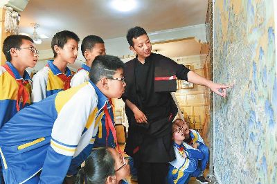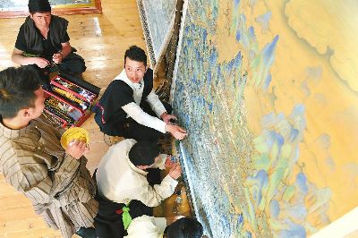 著著是當(dāng)?shù)匦∮忻麣獾漠嫀?,?4歲從臨摹、勾線定型、著色染色開始學(xué)起,3年后就出師獨(dú)立作畫。17年時(shí)間,他繪制了3000多平方米的壁畫和數(shù)百幅唐卡,光筆就畫禿了20000多支。去年,著著憑借《南絲路一帶緣藏漢人一家親》成為當(dāng)年文藝界最高獎(jiǎng)山花獎(jiǎng)的獲得者。今年,他圍繞“一帶一路、藏漢和睦”為主題而創(chuàng)作的大幅唐卡畫作也即將收尾。