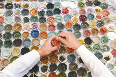 傳統(tǒng)的唐卡是藏族文化中一種獨(dú)具特色的繪畫藝術(shù)形式,需經(jīng)繃布、打磨、定位、起稿、涂色、暈染、拉線條、拉金線等多種程序,天然原料作色保證了畫作幾百年后色澤還依然鮮艷。在著著的畫室里,擺放了百個(gè)裝滿各色礦物質(zhì)顏料的調(diào)色小碗,“上色用的是延續(xù)千年的礦物研磨顏料?!睘榱俗岊伭献魃鶆颍€用自己的辦法搞出了專用的顏料攪拌機(jī)。