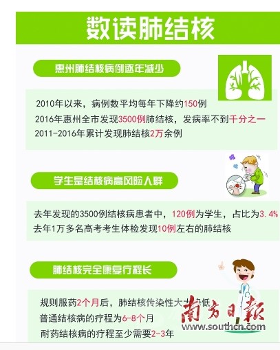據(jù)惠州市結(jié)防所相關(guān)負(fù)責(zé)人介紹,惠州市近年(2011—2016年)發(fā)現(xiàn)肺結(jié)核病例2萬余例,絕大部分患者都能治愈,治愈率達(dá)到90%以上。2010年的一項(xiàng)流行病學(xué)調(diào)查顯示,惠州市結(jié)核病發(fā)病率為千分之二,目前這一數(shù)字已降至不到千分之一?!叭ツ臧l(fā)現(xiàn)3500例,發(fā)病率略低于全省平均水平,并且發(fā)病趨勢近年來逐年下降,2010年以來,病例數(shù)平均每年下降約150例。”劉志東表示,這跟防控工作的成效以及人們防護(hù)意識的提高密不可分。然而,目前結(jié)核病的防治仍然面臨嚴(yán)峻的形勢:一是發(fā)病人數(shù)多;二是耐藥結(jié)核病流行;三是學(xué)校存在發(fā)生結(jié)核病疫情的潛在風(fēng)險(xiǎn)。