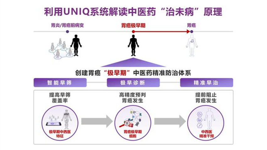 利用UNIQ系統(tǒng),結(jié)合大規(guī)模臨床病例的采集和檢測,李梢?guī)ьI(lǐng)團隊發(fā)現(xiàn)了胃癌“極早期”這一全新的階段,中醫(yī)上主要表現(xiàn)為本虛標(biāo)實、寒熱失衡。從中醫(yī)典型病例中還發(fā)現(xiàn)寒、熱舌苔菌群等新型標(biāo)志物,尤其是首次構(gòu)建了胃炎癌轉(zhuǎn)化的單細(xì)胞網(wǎng)絡(luò),發(fā)現(xiàn)了與胃早癌細(xì)胞高度接近的胃癌極早期細(xì)胞。經(jīng)2700余例胃炎癌轉(zhuǎn)化序貫病例樣本驗證,發(fā)現(xiàn)該標(biāo)志物能夠使得胃癌發(fā)生的預(yù)判提前10個月,準(zhǔn)確率達85%。探測出的胃癌極早期細(xì)胞如果處于萌芽期,進行中藥干預(yù)就可能延緩甚至阻斷其癌變,有望為解決我國胃癌早診率低的難題提供突破口。