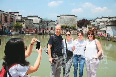 圖為外國(guó)游客在中國(guó)安徽宏村合影。新華社發(fā)