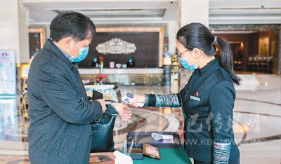 工作人員在內(nèi)蒙古自治區(qū)呼和浩特市一家飯店為進(jìn)店就餐的顧客測(cè)量體溫。