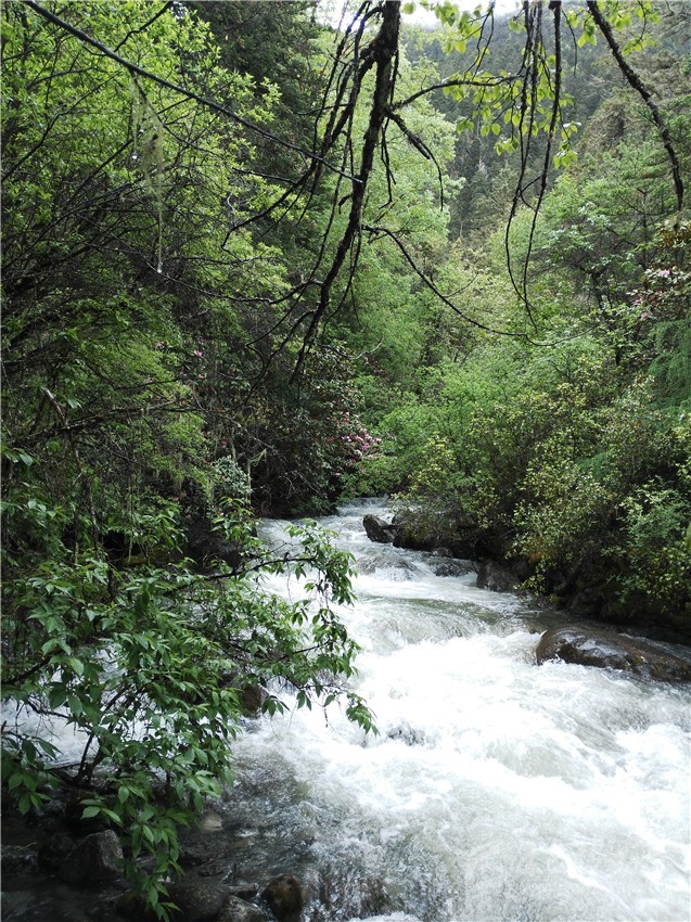 杜鵑花!又有美女的驚叫把我們的視線拉到了另一個(gè)方向,也即我們左手山坡上,一大片姹紫嫣紅的杜鵑花正灼灼綻放于郁郁蔥蔥的林木之間。而這時(shí)也就發(fā)現(xiàn)了,左手邊其實(shí)是一片花的海洋,各類不知名的花朵競(jìng)相爭(zhēng)艷,把拉角溝初晴的時(shí)空打扮得格外妖艷。于是眾人紛紛拿出手機(jī)兼相機(jī),將這難得一見(jiàn)的景致拍攝下來(lái),而這一過(guò)程中,美女們總忘不了騷首弄姿地把自己擺進(jìn)畫面之中,雖然這些美女都是妖婆級(jí)的美女了。至于男士,多數(shù)則呵呵笑著看著,頗有閑庭信步、云卷云舒之意。