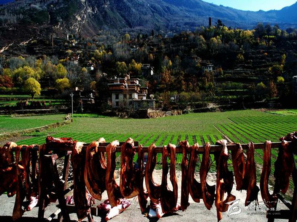 丹巴嘉絨藏族年期間,在酸菜包子、火燒饃、香豬腿等眾多的風(fēng)味飲食中,“藏香豬腿”是必不可缺的美食佳肴,也是給長輩拜年和親朋好友間互送的最佳禮品。“藏香豬腿”的制作方式也象丹巴嘉絨藏族年一樣的獨特。丹巴人宰殺年豬的方式通常有用繩索死吊或者用刀從勁入殺心臟致死兩種,現(xiàn)在采用后一種方式宰殺豬居多。當(dāng)?shù)厝藢⒇i宰殺后用熱水燙,處理好豬毛,再在胸口用刀開一孔,將手伸人胸腔扯斷心肺連接處,然后將其剖開,并把肥、瘦豬肉分離開,剝?nèi)グ逵?,處理好其他?nèi)臟,將豬腿按原形分離,爾后經(jīng)霜凍、柏枝熏、自然風(fēng)干后存放在儲藏室內(nèi)。豬腿存放一冬后,色、香、味俱佳。食用時煮成半熟或用炭火將表皮烘烤,切成小塊狀或撕成粉絲狀,在百米內(nèi)即可聞到香味,入口鮮嫩清香,營養(yǎng)豐富,誘人食欲。