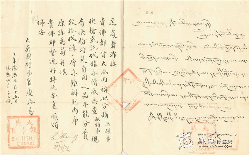 可以肯定的是,這就是給某位活佛的復(fù)信,除了稱呼佛都督(這是在當(dāng)時(shí)對(duì)活佛的通行的敬稱)可以看出外,還有藏文可以佐證。這張紙片上寫(xiě)道:昨接貴佛都督大函,內(nèi)稱,擬分購(gòu)敝領(lǐng)事館快槍或托代購(gòu)各情敬悉。查敝領(lǐng)事現(xiàn)有快槍均是自用之品,不能分賣(mài)。致于代購(gòu)一層,亦難辦到,尚希原諒為荷,并候貴佛都督近好,特此奉復(fù),順頌佛安。署名是大英國(guó)領(lǐng)事館官慶路易,日期為十年陰歷三月十五日,陽(yáng)歷四月二十二日。在公章下面注有公元1922年4月22日。