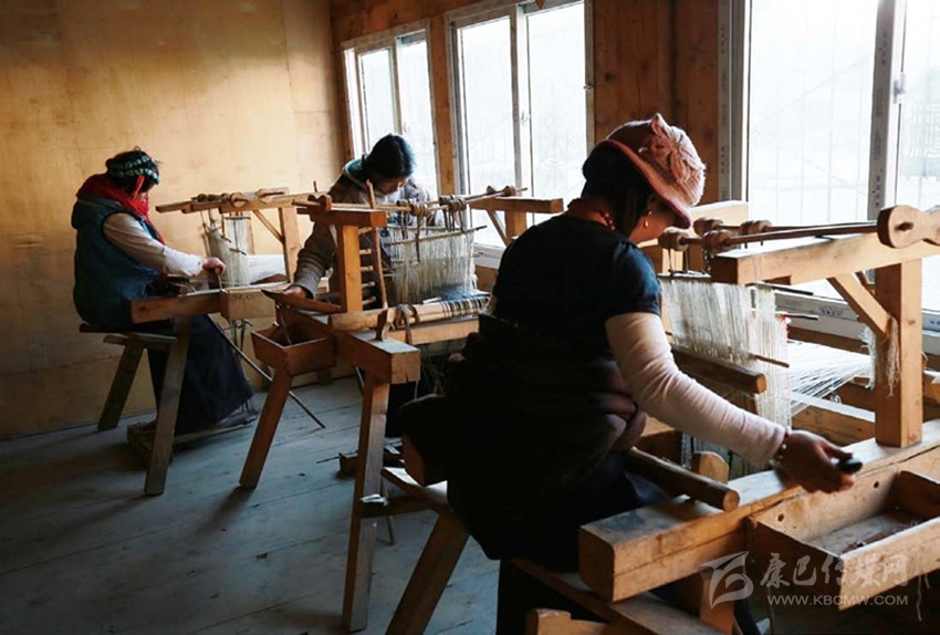 2003年,“編織班”邀請(qǐng)澤巴姆為老師,將這項(xiàng)技藝傳承了下來(lái)。現(xiàn)在,澤巴姆年紀(jì)大了,牛羊毛絨編織這樣繁復(fù)又耗體力的事情她不再做了,全交給了自己的媳婦扎西巴姆——當(dāng)?shù)匚ㄒ坏呐Q蚪q編織老師。第二天,我們?cè)诰幙棸嗟墓し焕镆?jiàn)到了扎西巴姆。工坊一角的木架上擺著為數(shù)不多的圍巾、墊毯等產(chǎn)品,窗邊平行擺著六臺(tái)織機(jī),扎西巴姆正帶著幾個(gè)藏族婦女坐在其間飛梭走線。陽(yáng)光從窗戶透進(jìn)來(lái),投射在織機(jī)和織女們身上,古老的場(chǎng)景、緩慢的節(jié)奏恍惚把我?guī)Щ亓俗婺傅臅r(shí)代。扎西巴姆說(shuō),當(dāng)?shù)厝朔Q牦牛絨為