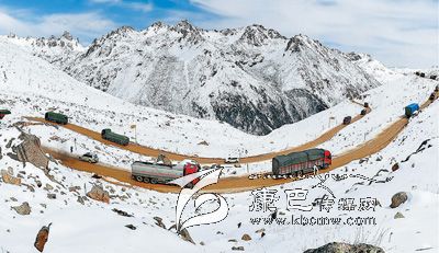 載重車輛在艱難地翻越雀兒山。