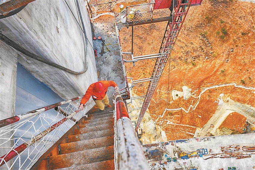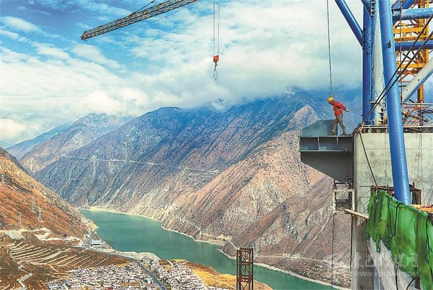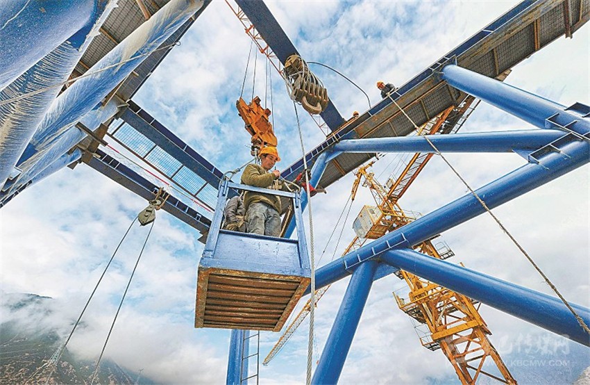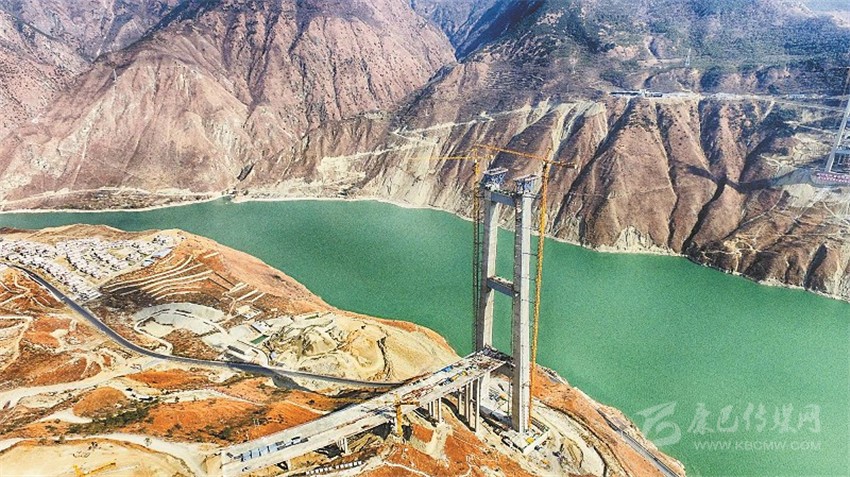 瀘定大渡河興康特大橋是雅康高速公路的重點(diǎn)控制性工程之一,是一座建在高海拔、高地震烈度帶上的超大跨徑鋼桁梁懸索橋,采用鋼混疊合橋道系,造價(jià)超過10億元,因建設(shè)技術(shù)難度大被譽(yù)為“川藏第一橋”。兩岸主墩索塔高188米,塔頂至河面垂直高差364米,橋橫跨大渡河,但在河中沒有橋墩,采取的是懸索橋設(shè)計(jì),在兩岸修建兩塔、兩錨,作為支撐和受力,橋面以懸索拉伸。未來,大橋?qū)⒁?/span>1100米的超長(zhǎng)跨徑連通大渡河兩岸,變天塹為通途。 (何海洋 攝影報(bào)道)