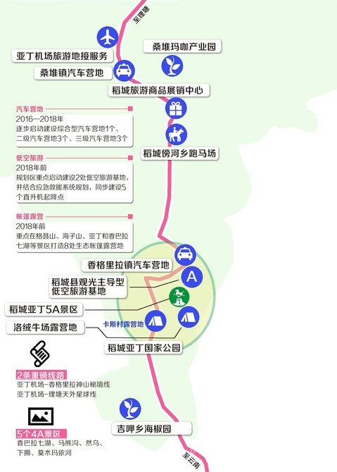 根據(jù)《規(guī)劃》,將結(jié)合道路交通和旅游景區(qū)景點(diǎn)分布,2016—2018年,逐步啟動建設(shè)綜合型汽車營地1個、二級汽車營地3個、三級汽車營地3個,作為建設(shè)環(huán)亞丁兩小時旅游圈的重要旅游項(xiàng)目,滿足日益增長的自駕車游客需求。