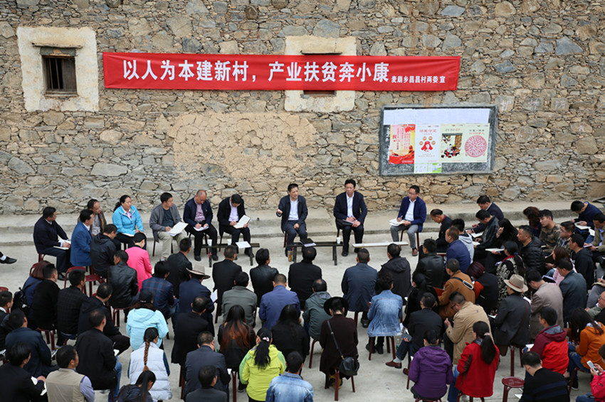圖為劉成鳴在麥崩鄉(xiāng)昌昌村以壩壩會(huì)形式與大家座談。