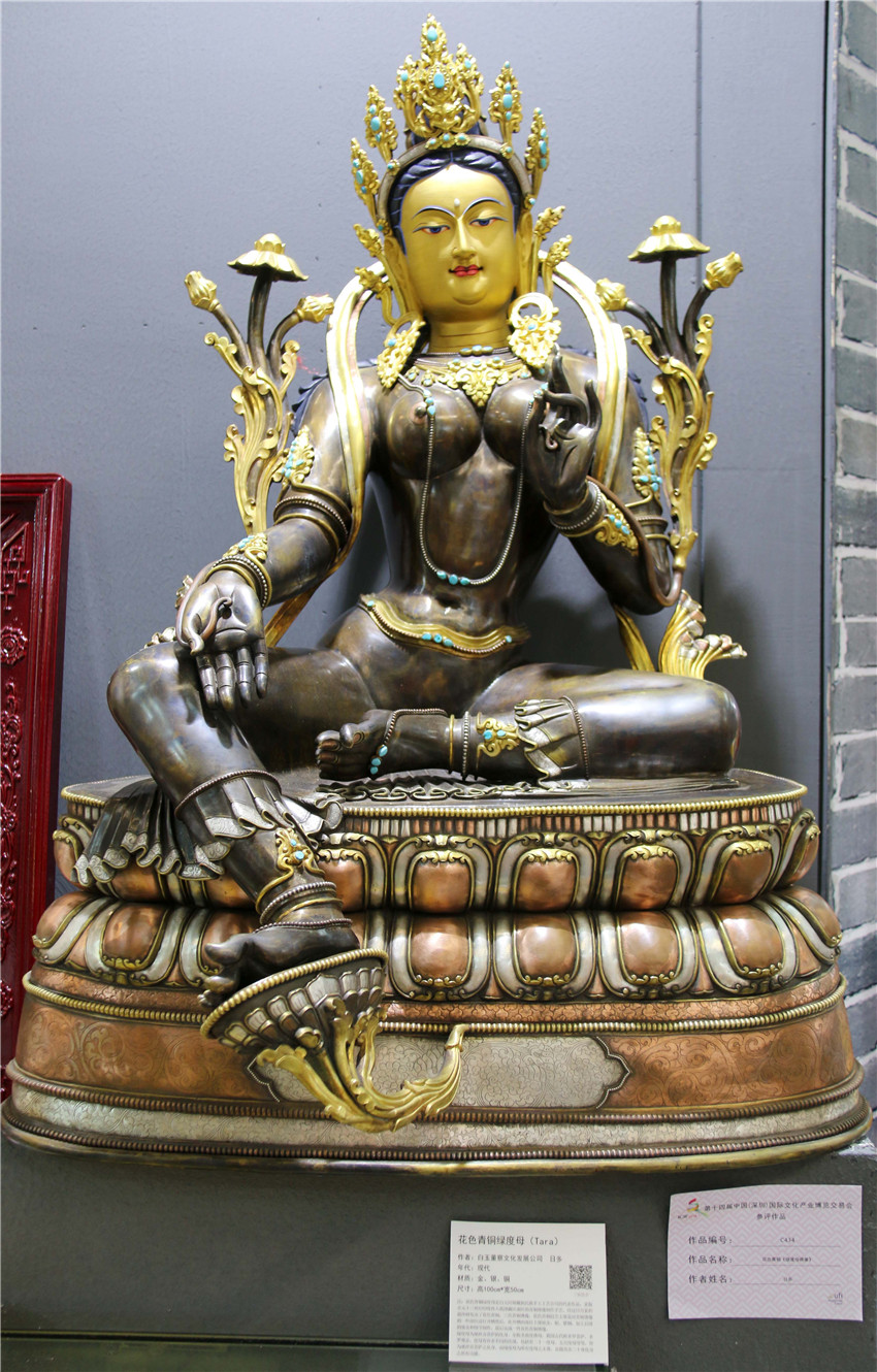 本網訊(記者 宋志勇 文/圖)“這是由什么材料鑄成的物件?”“這件作品的寓意是什么?”“這是一件花色青銅《綠度母佛像》,分別由金、銀、銅鑄成,高100cm、寬50cm,綠度母為觀世音菩薩的化身?!?月12日是第十四屆中國(深圳)國際文化產業(yè)博覽交易會第三天,甘孜展館迎來了眾多參觀者,在館內市民正與白玉縣董察文化發(fā)展有限責任公司董事長日多一問一答。