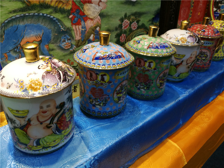 5月11日是開館第二天,付國華和馮建華就在燈光下對傳統(tǒng)陶瓷和高溫粉彩進(jìn)行比對。說起創(chuàng)作,57歲的付國華在認(rèn)識(shí)馮建華之前,對唐卡藝術(shù)有很深的感情,他非常喜愛這一文化,想方設(shè)法去創(chuàng)新。他說,唐卡藝術(shù)和陶瓷藝術(shù),都是最民族,最世界的中華文化藝術(shù)瑰寶。將兩大藝術(shù)結(jié)合創(chuàng)造更精美的陶瓷唐卡,是很多人的夢想,一代又一代的藝術(shù)家為此付出了不懈的努力。唐卡,最顯著的特點(diǎn)是色彩靚麗豐富,線條精細(xì)入微,是典型的工筆重彩。要在瓷板上畫唐卡,人們普遍使用的是“粉彩”工藝。粉彩工藝解決了唐卡的色彩和線條問題,但因其是中溫?zé)?900度以下),畫面附著在釉面上,所以怕磨損,易掉色,返鉛,晦暗,且含有害重金屬等缺陷十分明顯。在現(xiàn)有琺瑯彩、釉下五彩、斗彩等等陶瓷唐卡中,不能全面解決怕磨、掉色、返鉛、晦暗線條細(xì)膩等問題,難以滿足唐卡對色彩的色值,色域,線條的“精密度 ”要求,此類陶瓷唐卡“先天不足”就顯現(xiàn)出來了:比起原作唐卡,色彩范圍單調(diào),過渡生硬,無法精準(zhǔn)定位色值和線條,畫面顯得僵硬呆板,只能表現(xiàn)畫面比較簡單,色彩比較單一的唐卡。明顯失去了唐卡“熱烈奔放”“精細(xì)如發(fā)”的特點(diǎn)。看著他們苦心研制出高溫粉彩唐卡,在此次文博會(huì)上受到眾多觀展者的好評,付國華覺得這五年來付出的心血都是值得的。