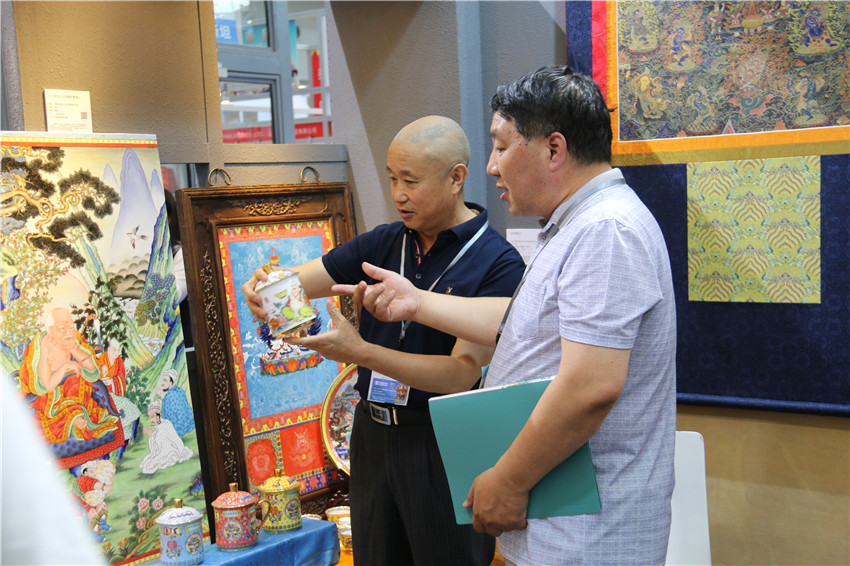本網(wǎng)訊(記者 宋志勇 文/圖)“我是一次摔壞陶瓷,成就了我和馮建華藝術(shù)合作?!边@是參加第十四屆中國(深圳)國際文化產(chǎn)業(yè)博覽交易會(huì)上,來自爐霍縣華彩文化傳播有限公司參展商付國華這樣說,而在馮建華心里,雖然這是他的鎮(zhèn)館之寶,但他對付國華這位千里迢迢從甘孜藏區(qū)來到景德鎮(zhèn),感到自豪和高興,于是結(jié)下了深厚的感情,因此完成了唐卡與陶瓷藝術(shù)的完美結(jié)合——高溫粉彩瓷板。