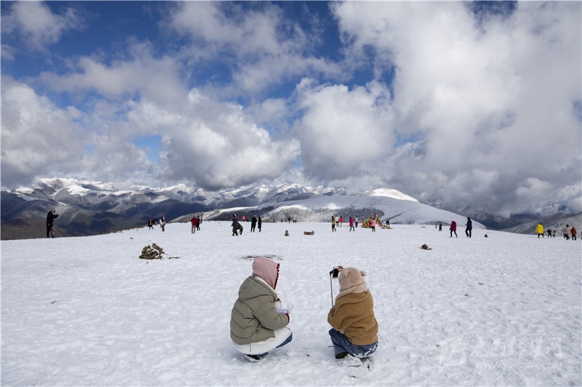 圖為在318國道四川卡子拉山埡口,游人在雪地里留影、嬉戲。