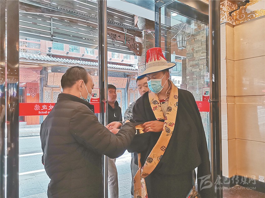 色達(dá)縣演出隊(duì)入住邦金麥朵酒店。每天,酒店安保人員多扎準(zhǔn)時(shí)出現(xiàn)在門口,提醒演職人員測(cè)量體溫、佩戴口罩?!拔沂蔷频甑牡谝魂P(guān)卡,拉姆是第二關(guān),我倆相互配合,表演節(jié)目的客人住得放心,演出的節(jié)目才會(huì)更加精彩。”拿著體溫槍,多扎一臉自豪地說(shuō)。