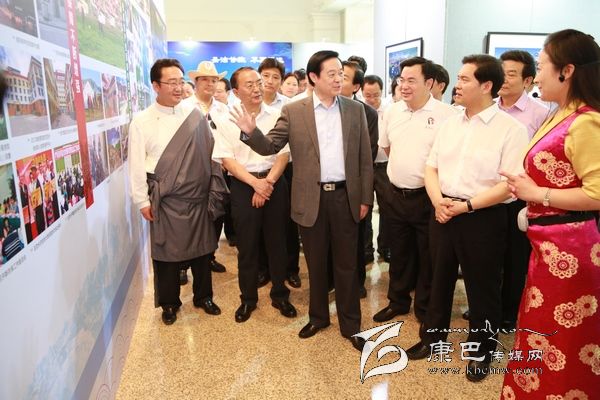 6月8日上午10時,劉奇葆、王正偉來到民族文化宮,首先走進(jìn)四川甘孜藏區(qū)發(fā)展成就暨旅游圖片展現(xiàn)場。這里,展示的是甘孜藏區(qū)經(jīng)濟(jì)社會發(fā)展成就、自然風(fēng)光、歷史文化、民族風(fēng)情、田園藏寨等方面內(nèi)容的圖片。一幅幅圖片,一個個場景,劉奇葆都非常熟悉。在四川工作期間,他曾十幾次奔赴甘孜藏區(qū)考察,足跡遍布全州18個縣。劉奇葆仔細(xì)觀看展示圖片,并不時詢問交通通信、優(yōu)勢產(chǎn)業(yè)等發(fā)展情況以及民生改善的情況。劉奇葆說,甘孜山川秀美,民族風(fēng)情濃郁,是一方充滿生機(jī)和活力的土地,希望甘孜立足自身實(shí)際,大力發(fā)展農(nóng)牧業(yè)和文化旅游業(yè),大力加強(qiáng)生態(tài)建設(shè)和環(huán)境保護(hù),大力改善民生,努力走出藏區(qū)科學(xué)發(fā)展、跨越發(fā)展之路。