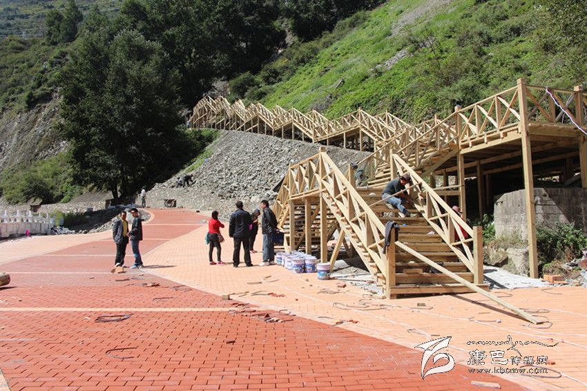 據(jù)該項(xiàng)目管理人員介紹,該條環(huán)山路,全長2公里左右,山路中還設(shè)計(jì)了一個(gè)較大的亭子,以這個(gè)亭子為中心,上通南無寺,下至將軍橋康定賓館處。其中有兩條階梯式藏式長廊與白土坎村的阿里布果游道相連接。在工作人員的引領(lǐng)下,筆者來到公主橋附近的項(xiàng)目地,遠(yuǎn)眺階梯長廊,就像一條黃龍蜿蜒在密林里,給情歌之城再添一抹神秘色彩。