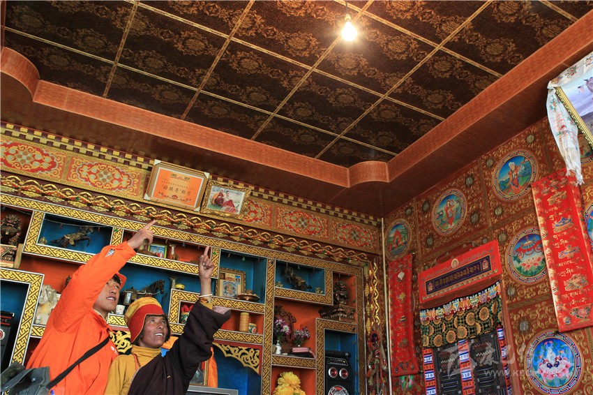 格吉大爺今年70歲了,他的孫子貢嘎是一名藏畫家,主要靠給鄉(xiāng)鄰的新房畫壁畫為生。他和哥哥兩人自學(xué)成才,鄉(xiāng)里很多人家屋內(nèi)那些精美絕倫的壁畫就出自他們兩兄弟之手。“以前電不好時(shí),天黑就無(wú)法工作,現(xiàn)在有電了,晚上都能畫,曾經(jīng)要畫1個(gè)多月的壁畫,現(xiàn)在20多天就能完成。如今電好了,電話信號(hào)也比以前強(qiáng),好多理塘縣城的朋友都打電話請(qǐng)我去給他們家里畫,這樣又能多掙些錢。”貢嘎的話語(yǔ)里透著對(duì)未來(lái)的幸福生活憧憬。