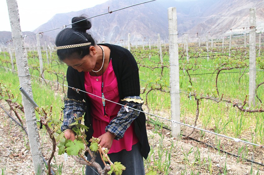 四郎吉村地處半山腰,干旱缺水、土地貧瘠,村民們以前都靠種植青稞來(lái)獲得收入?!斑^(guò)去,由于缺技術(shù)、葡萄的品質(zhì)不高,我家種的釀酒葡萄賣不出去;現(xiàn)在,太陽(yáng)魂公司承包了村民們的葡萄園,成立專業(yè)合作社,統(tǒng)一種植、統(tǒng)一管理、統(tǒng)一經(jīng)營(yíng),既規(guī)避了風(fēng)險(xiǎn),又為大家?guī)?lái)了很好的經(jīng)濟(jì)效益?!睂?duì)于村民仁青志瑪來(lái)說(shuō),生活的好轉(zhuǎn)都起因于小小的葡萄。