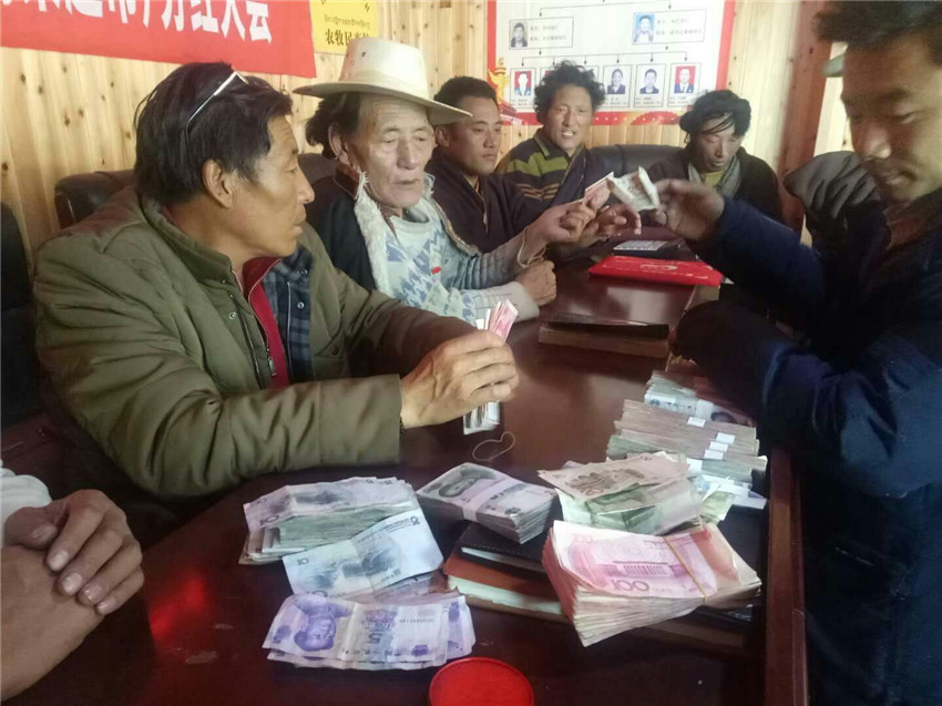 經(jīng)過(guò)5個(gè)月的經(jīng)營(yíng),收益明顯,21萬(wàn)元的純收入讓牧民添足了脫貧信心,村兩委將13萬(wàn)元作為合作社運(yùn)轉(zhuǎn)費(fèi)用,8萬(wàn)元分紅,再加上去年集體貯草基地純收入2.3萬(wàn)元,共計(jì)10.3萬(wàn)元,非貧困戶每戶最少分到了231元,最多分到了1227元,貧困戶每戶最少分到了516元,最多分到了1498元。