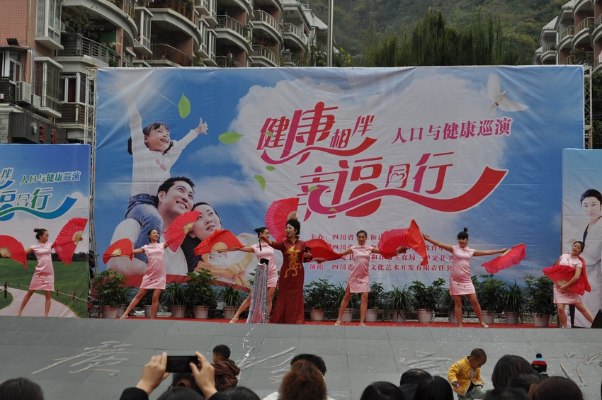 舞臺(tái)上“健康相伴•幸福同行”大型演出背景格外醒目,由省虹宇藝術(shù)團(tuán)自編自演的舞蹈《歌舞青春》、金錢(qián)板《怪哪個(gè)》、小品《你生不生》、四川清音《分級(jí)診療就是好》、雜技《烏依人》、戲曲《天府奇葩》等節(jié)目陸續(xù)登場(chǎng)。演員們通過(guò)戲曲、歌曲等形式,向廣大觀眾傳播衛(wèi)生計(jì)生新政策,臺(tái)下各縣屬醫(yī)療衛(wèi)生計(jì)生機(jī)構(gòu)醫(yī)務(wù)人員免費(fèi)開(kāi)展義診活動(dòng),為廣大群眾查血壓、詢(xún)問(wèn)病史、咨詢(xún)等忙個(gè)不停,群眾與演員互動(dòng)場(chǎng)面感人。演出活動(dòng)取得良好的教育效果,得到廣大群眾的熱烈歡迎。