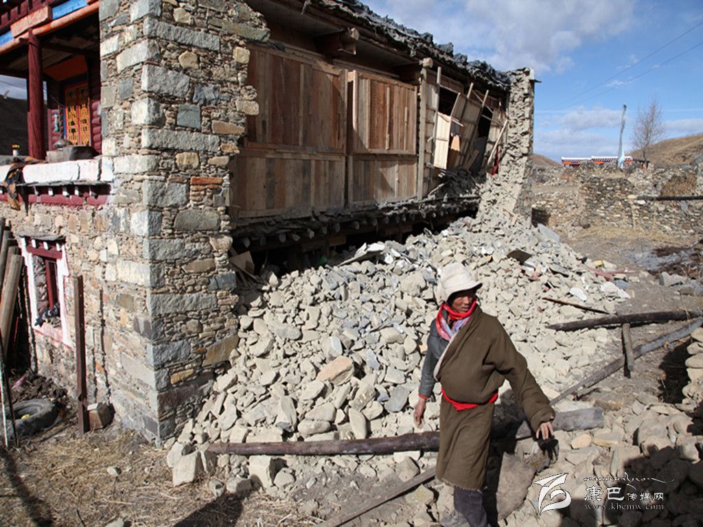 該村不少舊式藏居已經(jīng)徹底倒塌,瓦礫遍地。正在幫助村民搭建帳篷的中古村包村干部劉怡說,全村共189戶村民,125戶有房,受災110棟房,其中五組受災最嚴重,31戶房屋倒塌。這個村當年沒有被納入牧民定居建設(shè)。