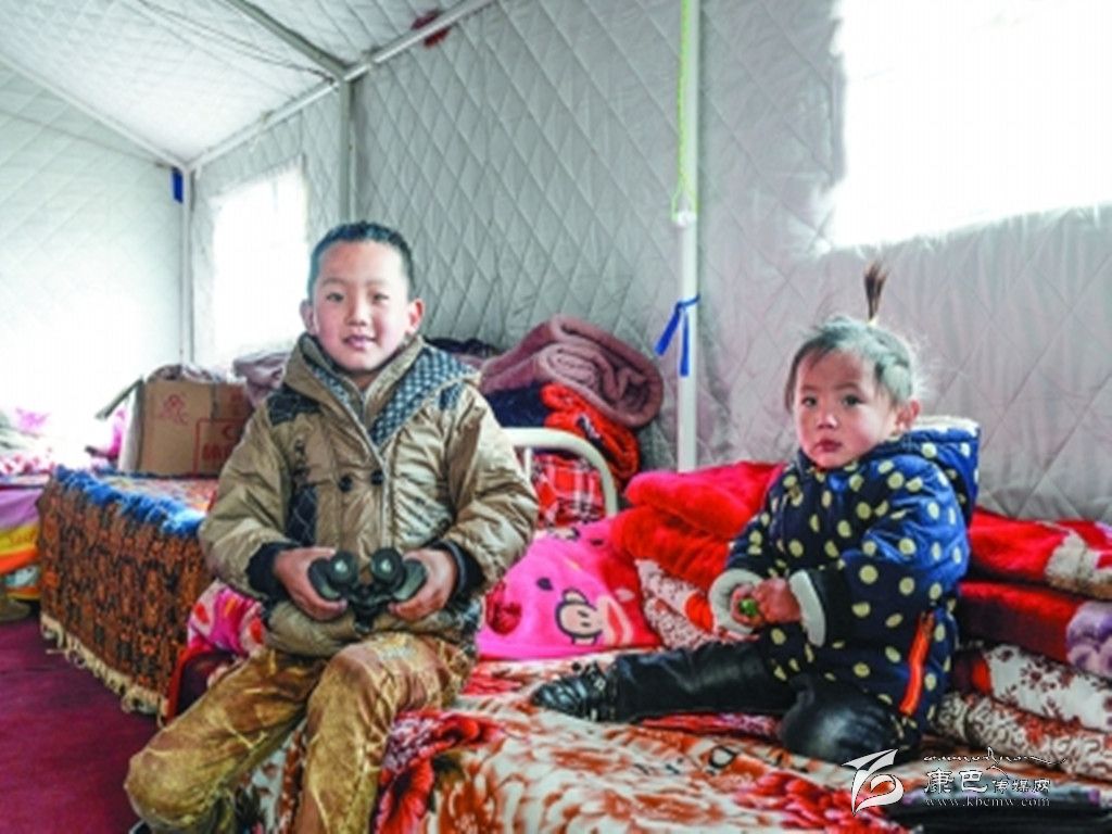 震后的第一個(gè)新年,記者在塔公鄉(xiāng)江巴村看到,一頂頂藍(lán)色的棉帳篷有序搭建在村民自家院落里。隆冬時(shí)節(jié),寒風(fēng)凜冽,走進(jìn)村民措科家的帳篷,一股熱浪卻撲面而來。小鋼爐上燒著熱水,帳篷里堆放著政府發(fā)放的幾床厚棉被,地上鋪著一層白色的防潮塑料薄膜,措科和三個(gè)孩子正圍著爐子烤火。