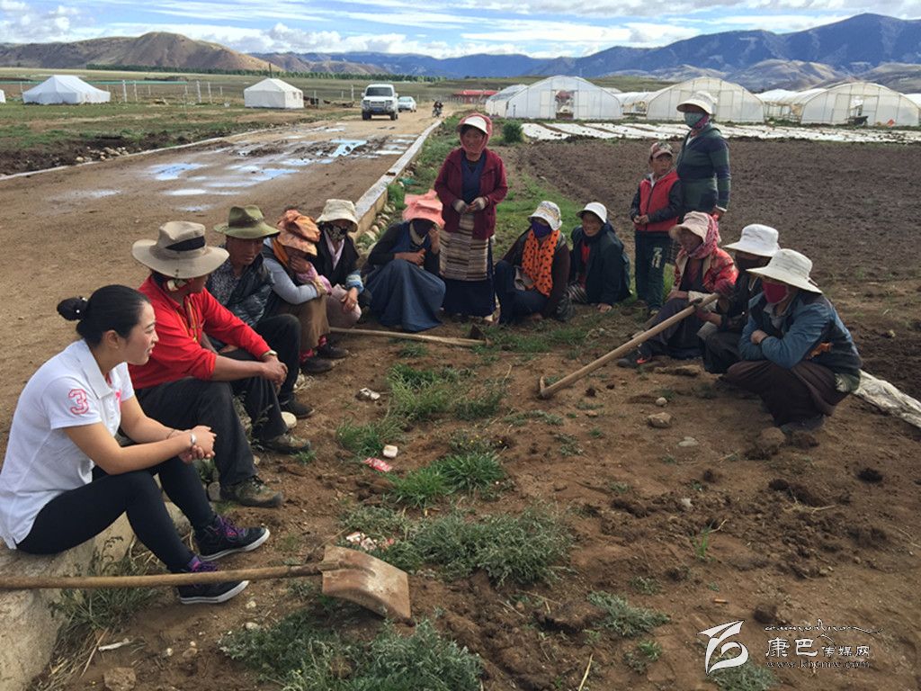 鄉(xiāng)黨委書記使朗擁忠(左一)了解村民在圣地農(nóng)莊打工及學(xué)習(xí)蔬菜種植情況︒ 葉強平 攝