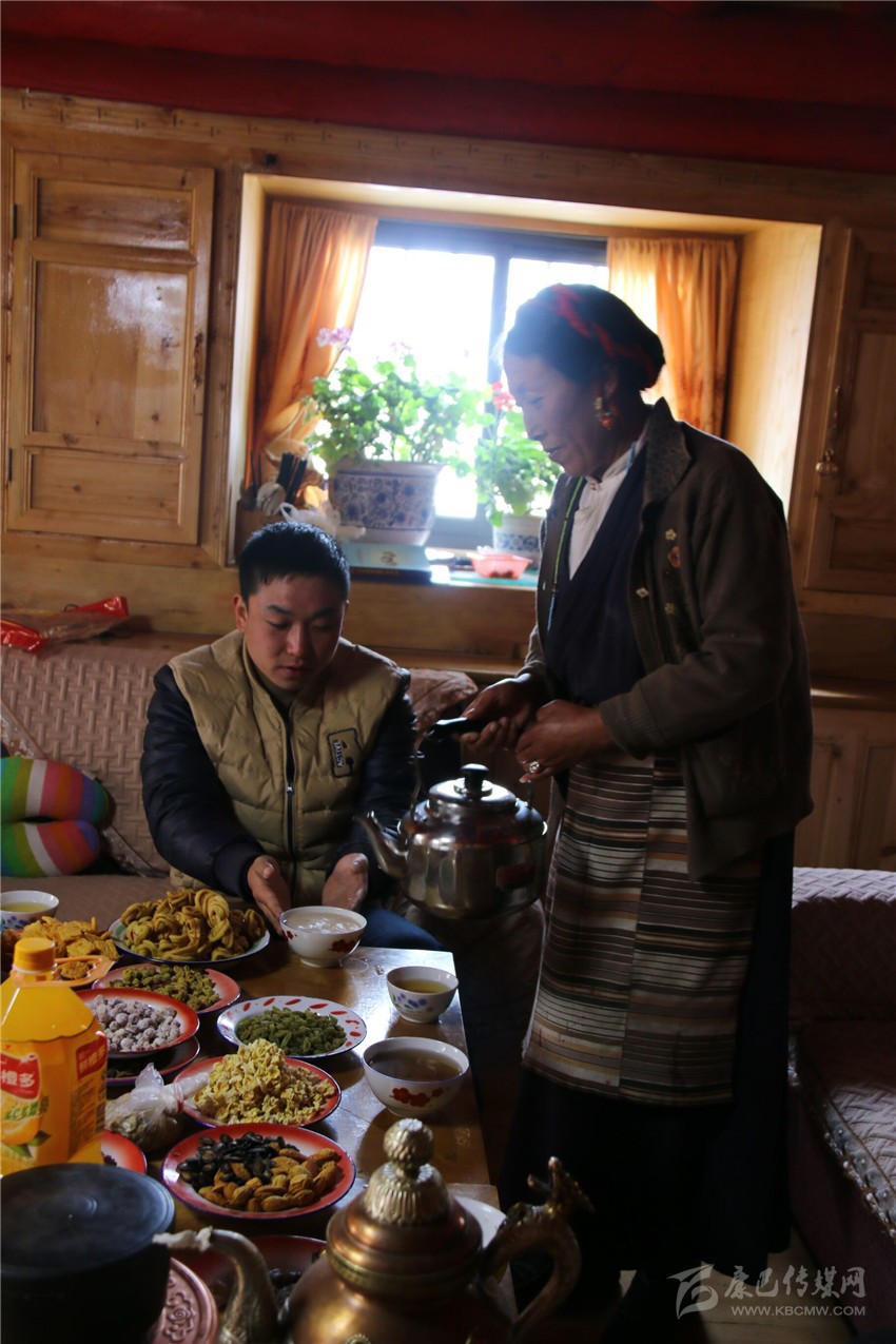 離開合作社,記者一行受邀前往村支部書記澤吉家里做客。汽車在整潔的入戶公路上行駛一陣后,一棟外觀精巧、色彩繽紛的寬大全木質(zhì)民居出現(xiàn)在記者眼前。走進(jìn)客廳,幾張擺滿了各種水果、飲料、干果、糖、酥油果子的藏桌引起了記者的注意,一位十來歲的女孩正在觀看藏歷新年春晚??吹接锌蜕祥T,澤吉的愛人立刻端來了熱騰騰的酥油茶和黃澄澄的青稞酒。