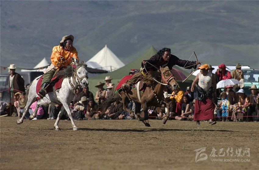 賽馬活動中的分耐力賽、小走賽、馬術表演等,馬術表演有馬背倒立、飛馬射擊、馬肚藏身、俯身拾哈達等項目。驚險刺激的賽馬,是充分展示藏區(qū)群眾健壯、靈巧和勇猛、膽大的一項活動,也是當?shù)厍鄩涯瓯绕雌潴w魄、智慧和膽識的舞臺,對年輕小伙兒來說,這還是一個捕獲心儀的姑娘的芳心的絕好時機。所以,在康巴地區(qū)的賽馬活動始終都保持著精彩、激烈的特征。