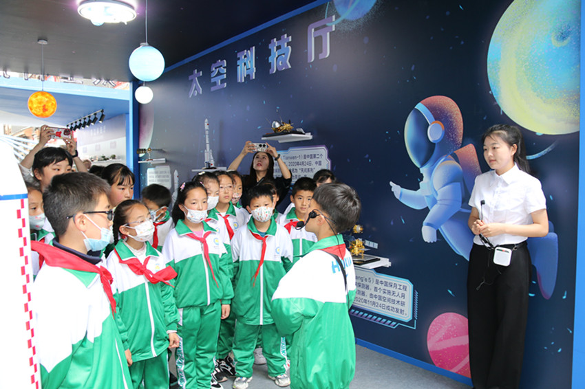 “航天夢是中國夢、華夏夢,神舟十六號載人飛船發(fā)射成功并進入預(yù)定軌道。古人仰望星空,幻想上天攬月的夢想,在一代代中國航天人的努力下逐漸變?yōu)榱爽F(xiàn)實?!薄凹t領(lǐng)巾”講解員劉嘉沐在解說他負責(zé)的天空科技廳時,將這一喜訊分享給了在場的同學(xué)們。“希望能借神舟十六號載人飛船發(fā)射成功的機會,在科普周活動中普及航天知識,讓更多的學(xué)生深入了解航天文化,引導(dǎo)青少年傳承航天精神、點燃航天夢想?!敝菘茀f(xié)負責(zé)人告訴記者。