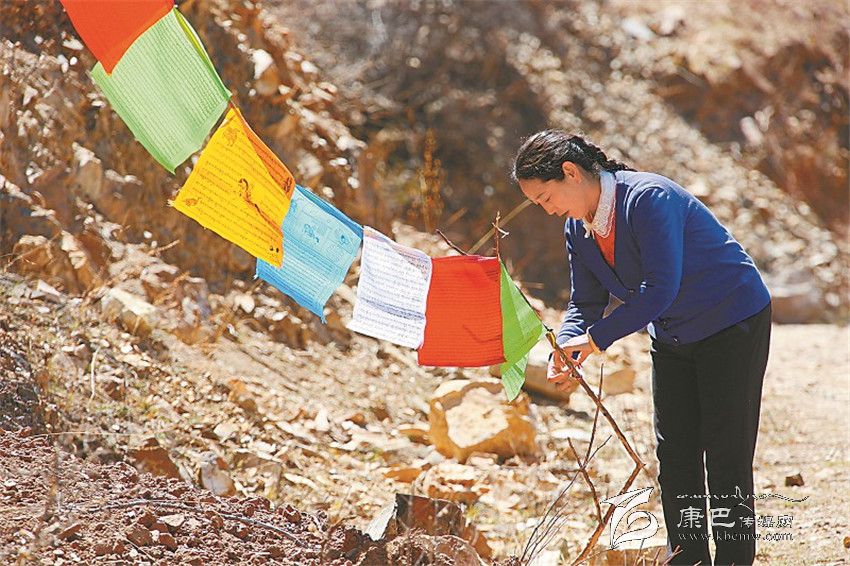 到達益西村布乃格時,杜勒突然發(fā)現(xiàn)前面有十多米路段已經(jīng)被洪流沖垮了一半。“停車!停車!不能再往前開了!”坐在副駕駛座上的杜勒急忙叫住丈夫,從身上斜挎的小包里拿出五六面風馬旗,拉開車門,幾步?jīng)_到了垮塌路段跟前。“不要再過去了,水里有石頭,一會兒被大水沖走了你就完了!”仁孜跟著跳下車,追著她喊??墒嵌爬詹活櫿煞虻暮艉?,蹲在垮塌路面的邊緣,伸出雙手將穿滿風馬旗繩子的一端系在路邊山壁的樹枝上。她身子傾斜,右腳伸直踩在被河水沖成斜坡的路基上,左腳彎曲踏著僅剩的一點路面,想將繩子綁得更加牢固。而風馬旗卻不聽使喚的在風雨交加中搖擺不定,杜勒心中此刻只有一個信念:風馬旗上系著的是萬千生命,無論如何也要綁牢實。“你是不是瘋了?路基都空了,要是垮下去你被大水沖走了怎么辦?”仁孜話音剛落,杜勒右腳踩著的那塊泥土突然整塊塌了下去。仁孜一把抓住她的手臂,把她拽了上來。“如果當時是她一個人,那肯定沒命了!”仁孜把她拖回車上才發(fā)現(xiàn),杜勒卷起褲管兒的腿上布滿了青青紫紫的淤痕,雙腳顫顫巍巍,幾乎站不穩(wěn)?;氐娇h城后,醫(yī)生告訴杜勒短時間內(nèi)不能走路,要多休息??墒?,當天下午,杜勒趁仁孜上班,自己找了一根竹棍子拄著,又趕到下一個坍塌路段做著重復(fù)的工作。