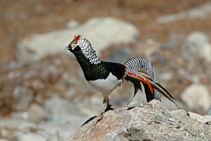 白腹錦雞(學(xué)名:Chrysolophus amherstiae):藏語(yǔ)譯音:甲嚇破呷妞仁 別名:銅雞、寬寬雞 國(guó)家II級(jí)保護(hù)動(dòng)物,見(jiàn)于瀘定、康定、丹巴、九龍等。 雄鳥(niǎo)全長(zhǎng)約140厘米,雌鳥(niǎo)約60厘米。雄鳥(niǎo)頭頂、背、胸為金屬翠綠色;羽冠紫紅色;后頸披肩羽白色,具黑色羽緣;下背棕色,腰轉(zhuǎn)朱紅色。飛羽暗褐色。尾羽長(zhǎng),有黑白相間的云狀斑紋。腹部白色。嘴和腳藍(lán)灰色。雌鳥(niǎo)上體及尾大部棕?